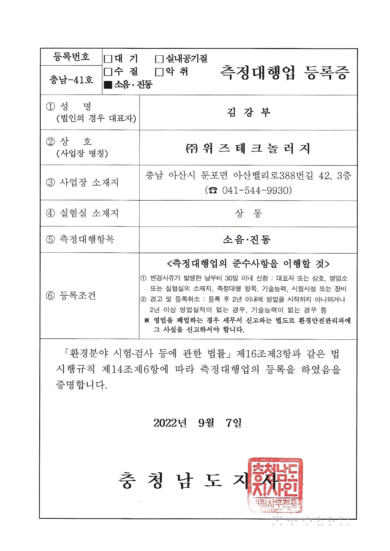 소음진동 측정대행업 등록증