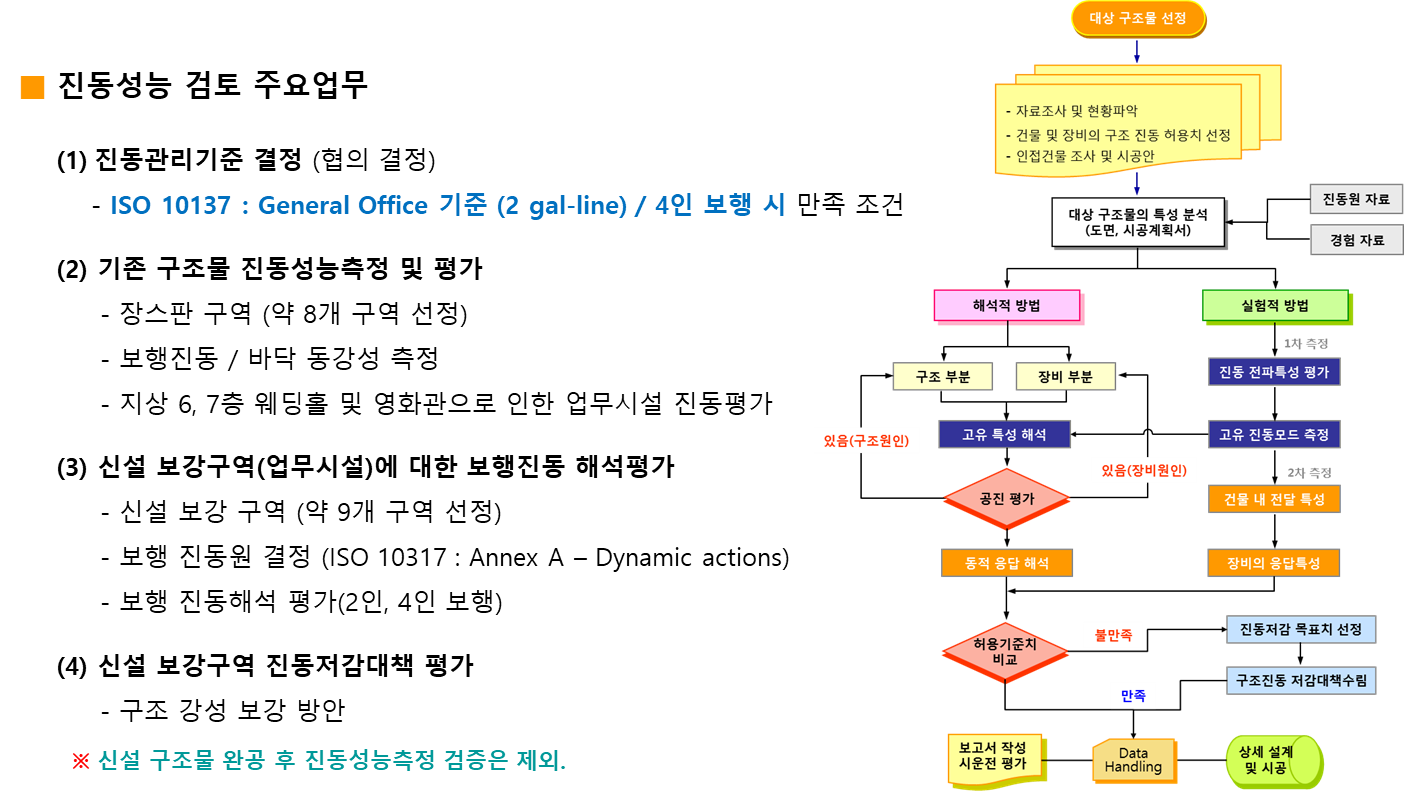 진동관리기준 결정 / 기존 구조물 진동성능 측정 평가 / 신설 구조물 진동성능 해석 평가