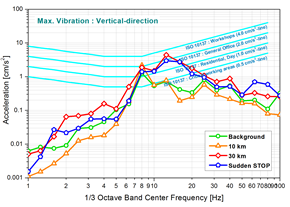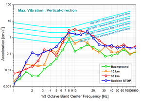 ③ 작업자 보행, 이송 진동(impact vibration) : 충격성 진동이 반복하는 특성을 가지며, 구조물의 동적(動的) 특성에 지배되는 진동이다. 이것은 구조물 보(Beam, Girder 등)의 동적 설계의 기준이 되는 Dynamic Mobility를 결정하는 중요한 설계 인자(因子)이다. 이러한 충격 신호에 대한 평가는 시간 특성과 Energy Density로서 일반적으로 평가하지만, 정밀장비에 대한 진동 영향성 문제를 다룰 경우, 구조물의 공진 주파수를 가진하기 때문에 시간 신호에 대한 정밀장비의 응답특성을 해석과 측정을 동시에 수행할 필요가 있다.