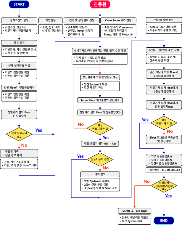 ② 지반 및 건물의 기초진동(random vibration) : 외부의 교통이나 공사장에서 불규칙하게 발생하는 진동이 지반을 매질로 하여 건물 기초에서 건물 내부로 전파되는 진동으로서 반도체 공장의 부지선정 및 입지를 결정할 경우에 고려되는 중요한 설계 요인 중의 하나이다.